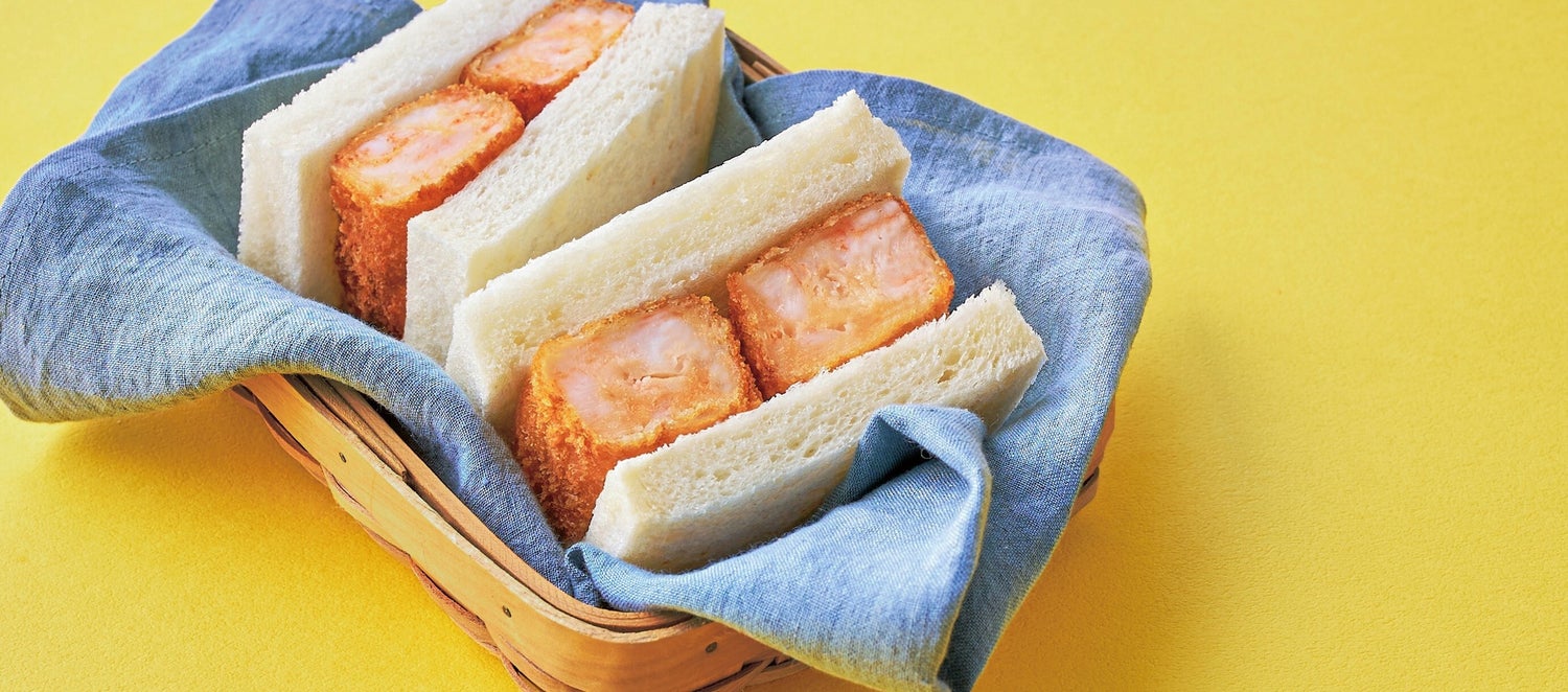 サクッと衣にぎゅっと詰まった、海老の身と帆立の旨みをこだわりの一等小麦粉食パンでサンド!